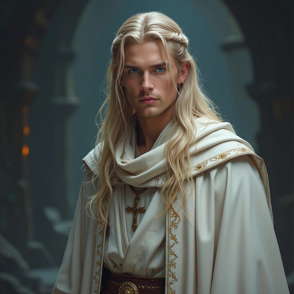 This image shows a tall Aasimar cleric in light robes, searching for truth in a dark place. The matte painting style features deep, complementary colors and intricate details, creating a fantasy concept art aesthetic.