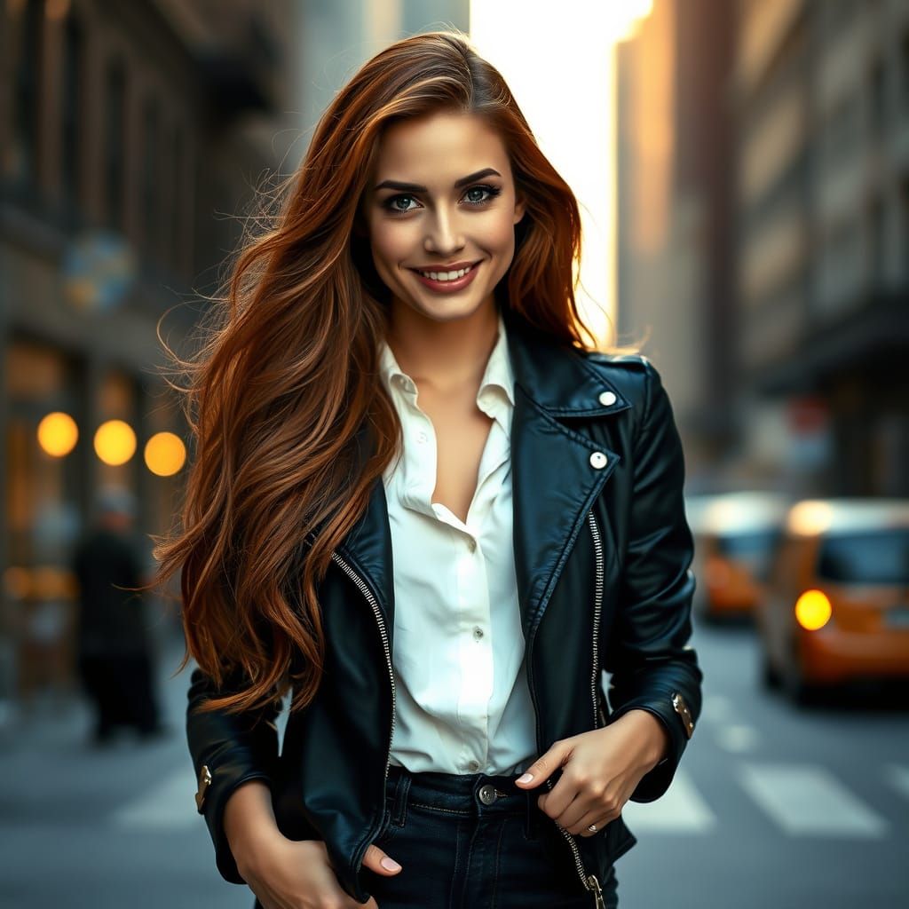 A captivating image of a woman with auburn hair and blue eyes, smiling confidently. She wears a leather jacket and jeans against a blurred cityscape with golden lights, in a photorealistic style.
