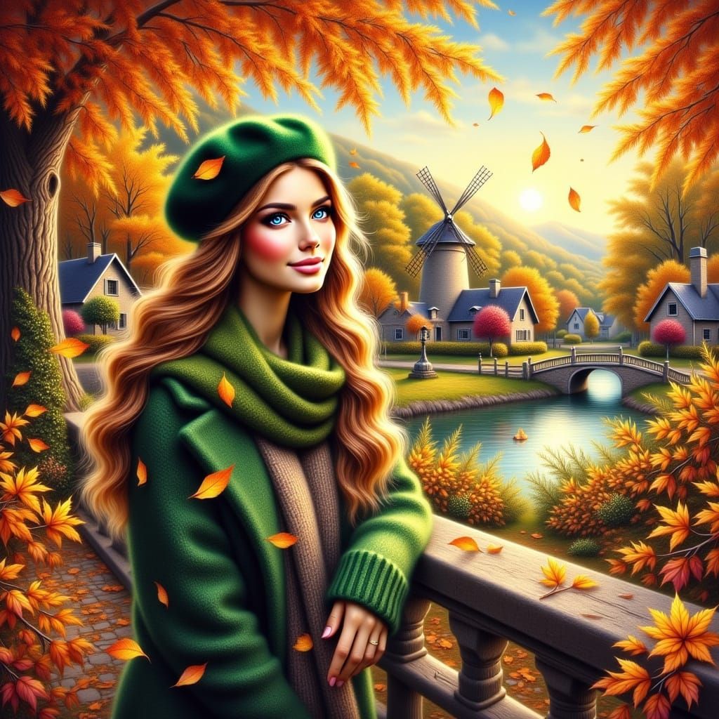 This image shows a young woman in autumnal attire, smiling warmly. The scene features a scenic background with a windmill and houses, rendered in a soft, airbrushed oil painting style with vibrant, warm tones.