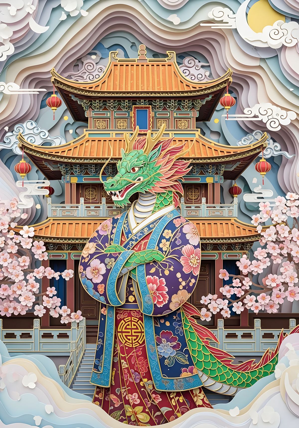 This image shows a detailed paper sculpture of a dragon. The dragon is anthropomorphic, standing upright to guard the entrance of a traditional Chinese temple.