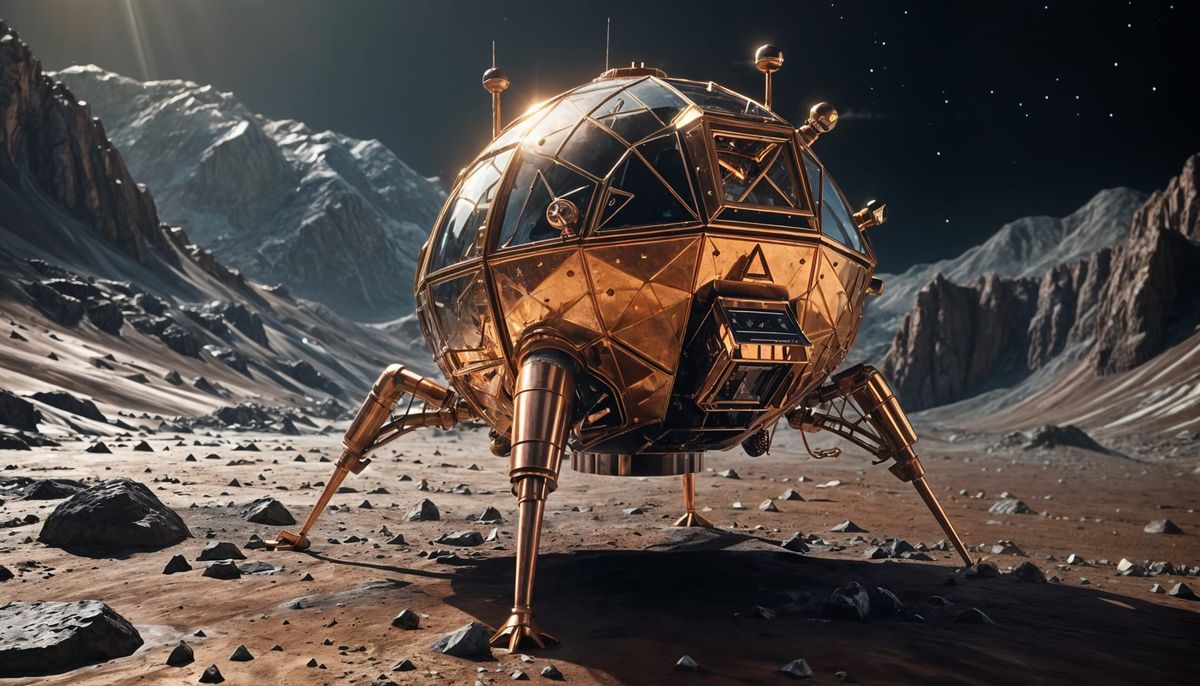 A steampunk lunar lander sits on the moon in this image. Copper rivets and accents adorn the craft, reflecting light. Jagged mountains rise behind it, with Earth visible in the starry sky. The artwork is reminiscent of Cinema 4D.