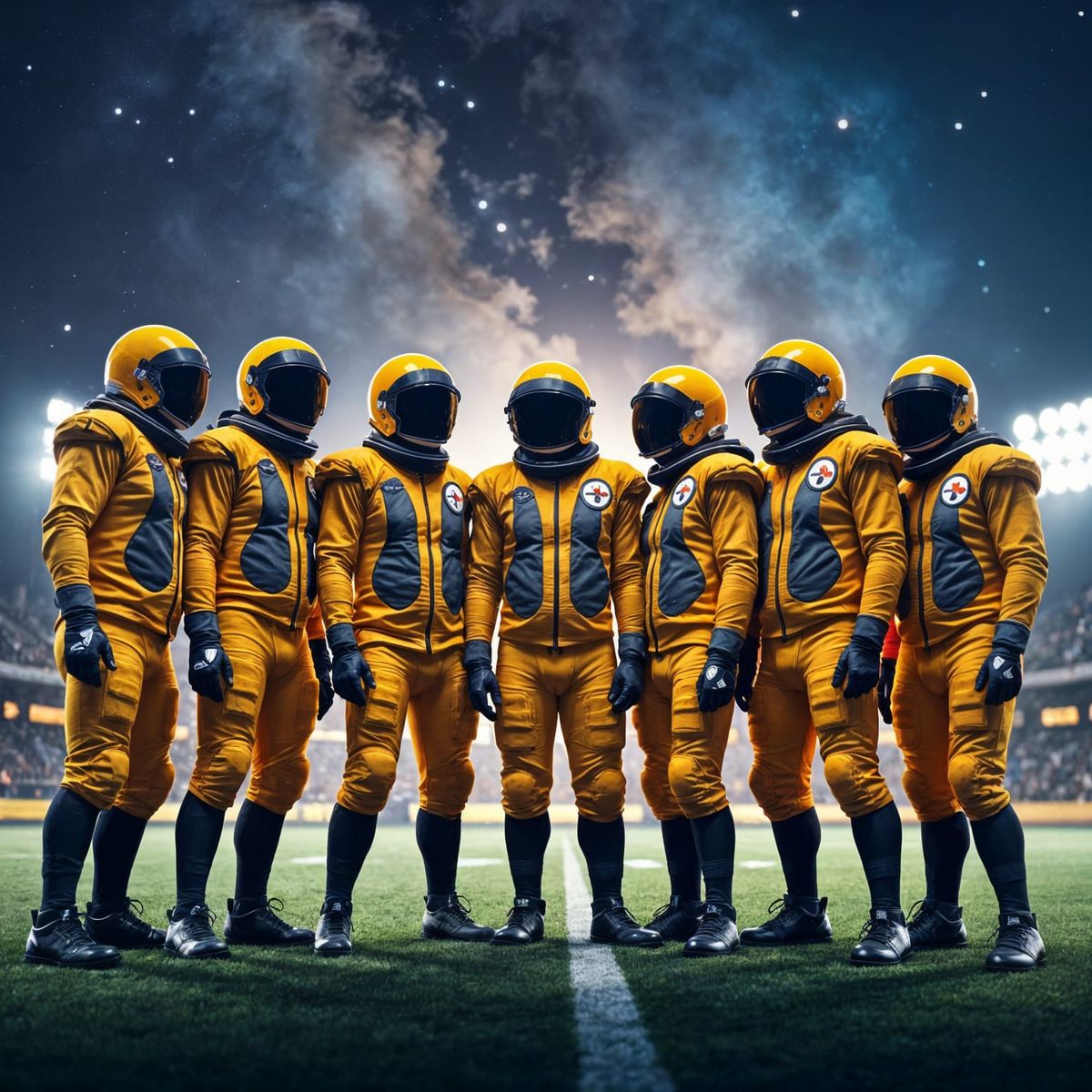 This image shows a group of astronauts in spacesuits inspired by the Pittsburgh Steelers, standing on a football field under a cosmic sky. The image has a digital art aesthetic.