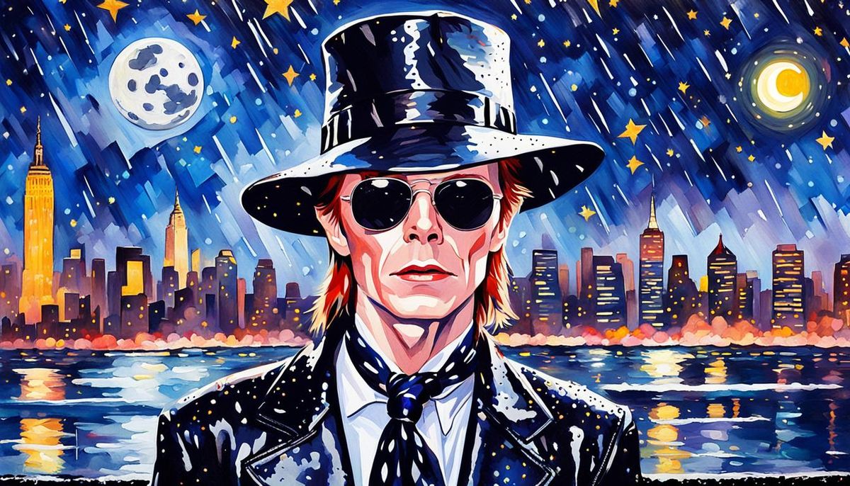 A vibrant pop art image of a person with David Bowie's short hair wearing a black leather jacket, top hat, sunglasses and scarf, standing in the rain with the New York skyline in the background.