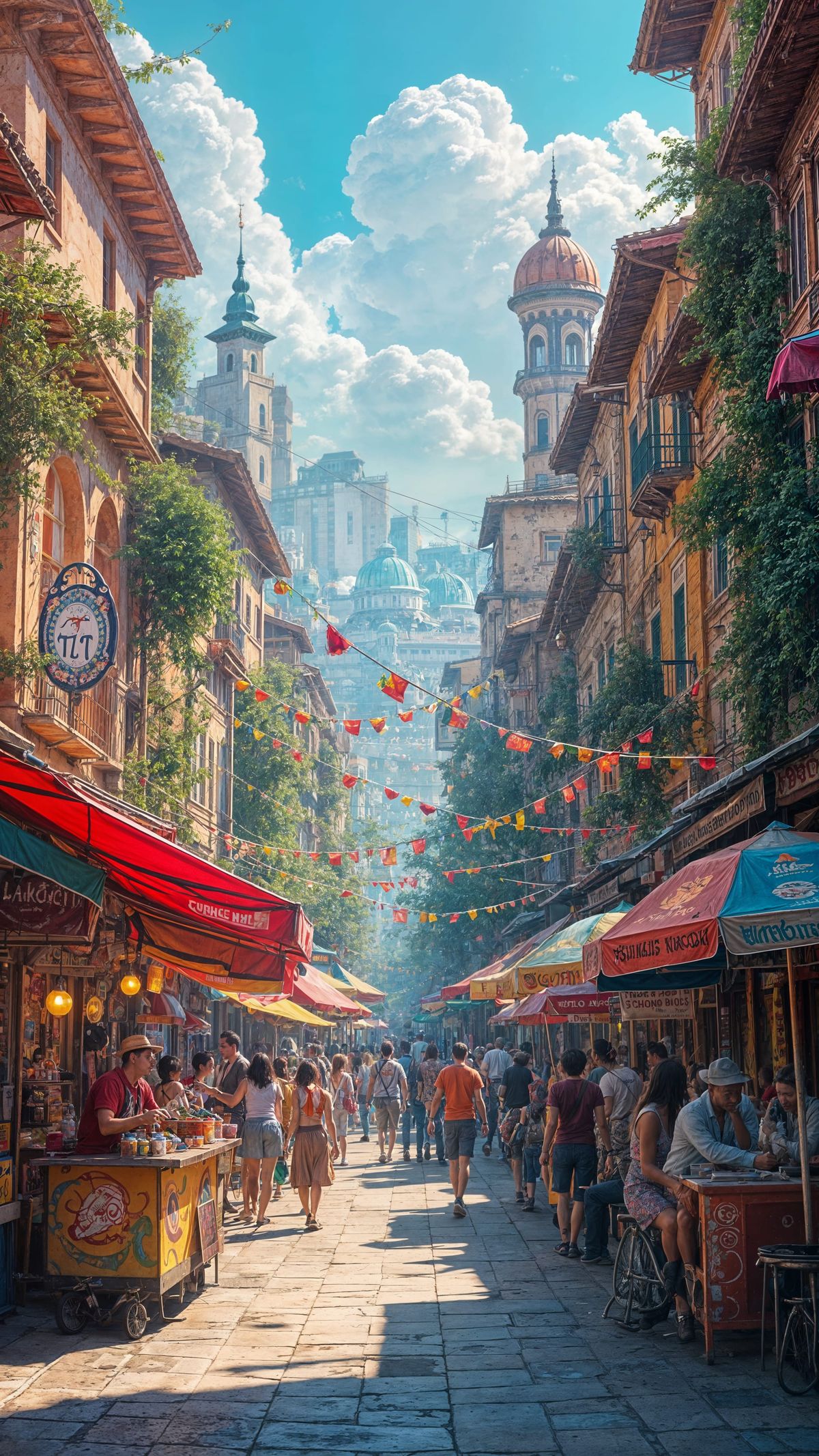 A vibrant urban neighborhood comes alive with colorful street art and bustling food vendors. Rendered as detailed matte painting, the scene is rich with intricate detail and complementary colors.
