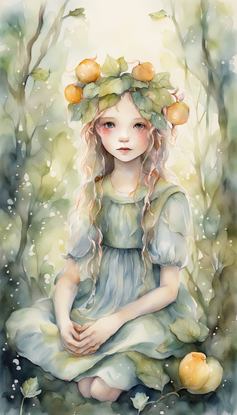 A delightful watercolor painting of a whimsical doll crowned with a Physalis alkekengi flower, resting in a sunlit forest. The image features soft, flowing brushstrokes and an enchanting, pastel color palette.