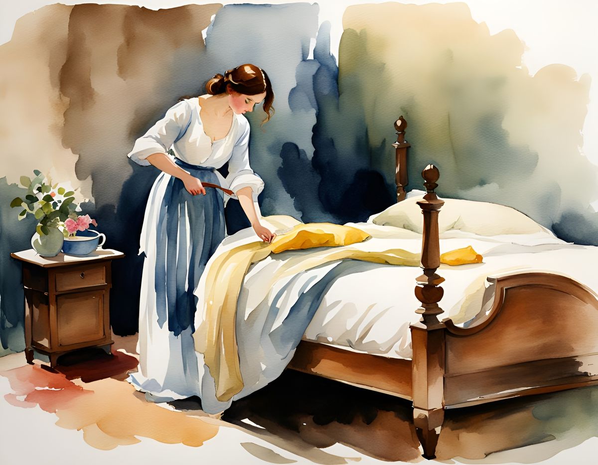 A watercolor painting of a woman making her bed. The artwork features the loose brushstrokes and wet blending techniques typical of the watercolor style.