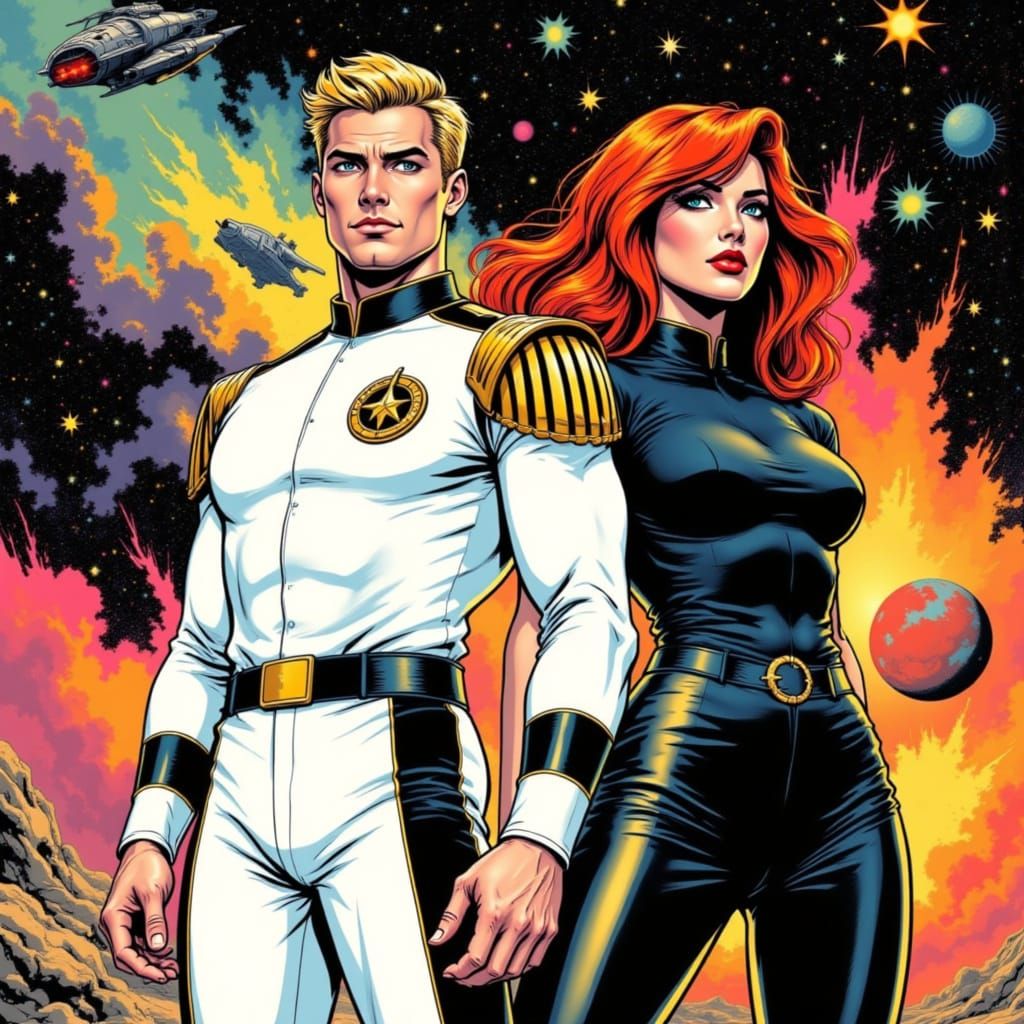 A comic book image of Buck Rogers and Wilma Deering against a swirling space background. The image features bold lines and vibrant retro colors in a classic comic style.