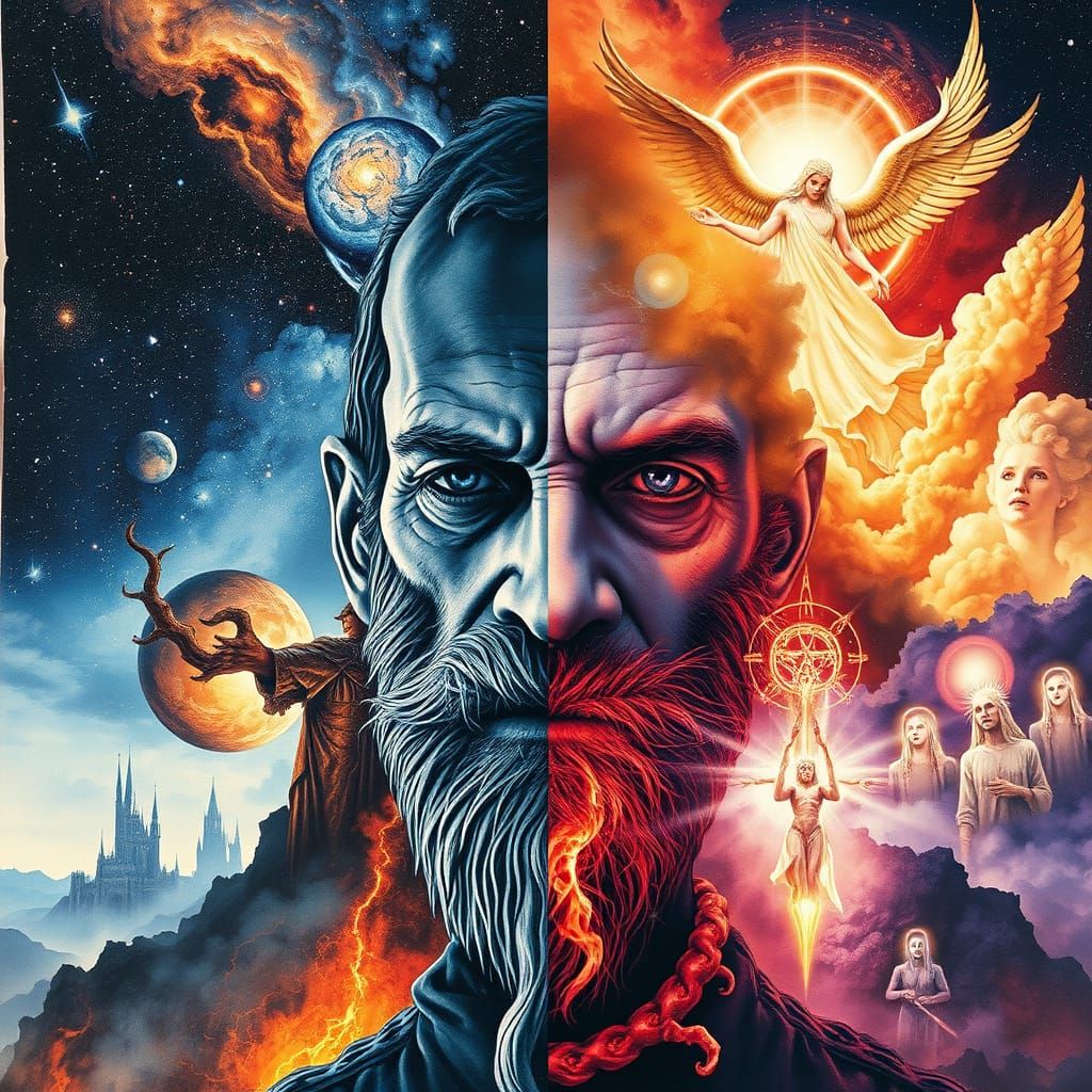 This hyperdetailed watercolor depicts a dual-natured cultist, showcasing cosmic horror, heavenly, hellish, and purgatorial realms. Features vibrant colors, surreal textures, and dramatic lighting in a cinematic style.