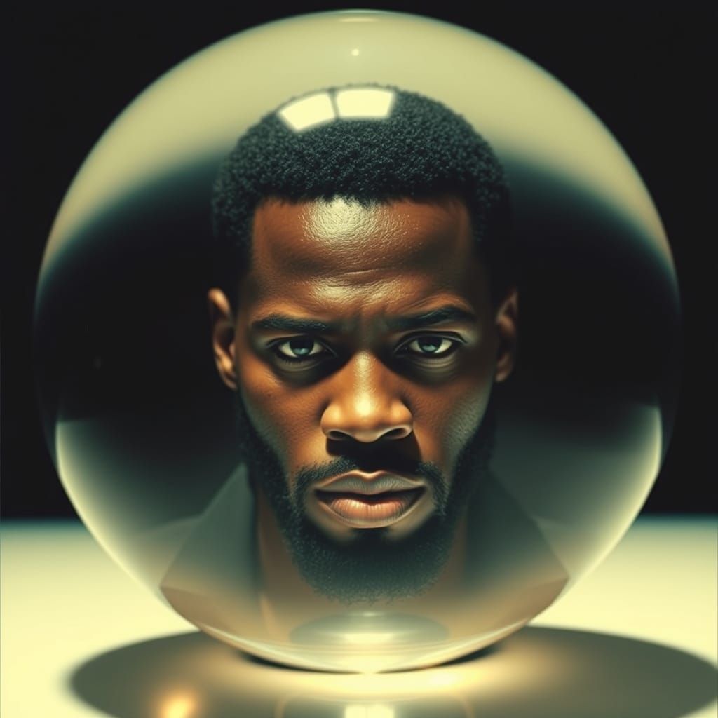 This image is a striking double exposure of a handsome black male, blending film noir and vaporwave aesthetics to create a haunting, dreamlike portrait.