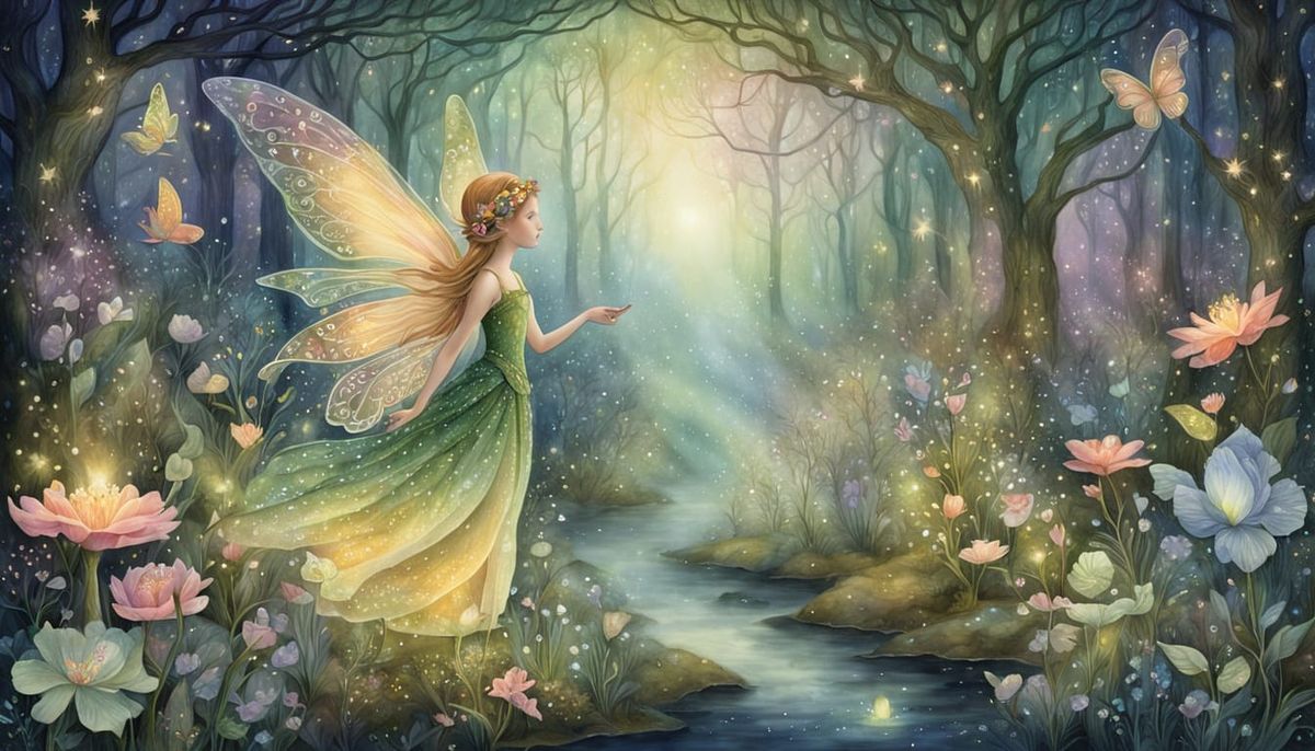 Jane Wormell art, watercolor, Gentle color gradient. Atmospheric perspective. Breathtaking masterpiece. Volume and depth lighting. Sparkle, glitter, fantasy world, magic.