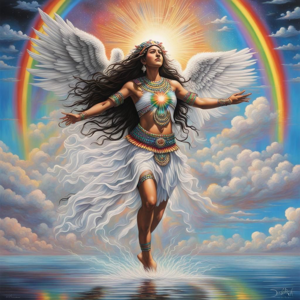This image shows a figure dancing in water, illuminated by divine lightning and stars. Rendered with intricate details and a vibrant color palette, it evokes a futuristic, cinematic feel.