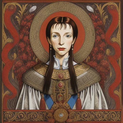 This image shows an abstract portrait resembling Jane Birkin as Boudicca. It features rigid geometric shapes and bold colors, creating a striking and unconventional depiction.