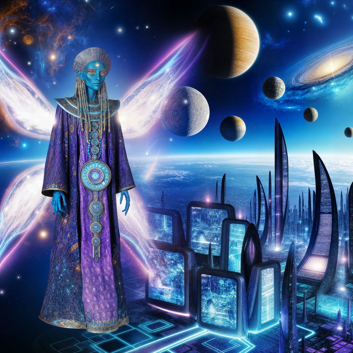 A striking picture of a futuristic extraterrestrial being called Annunaki, from a neon-lit purple and blue cityscape. The alien has wings and multiple glowing eyes, wearing garments blending technology and tradition.