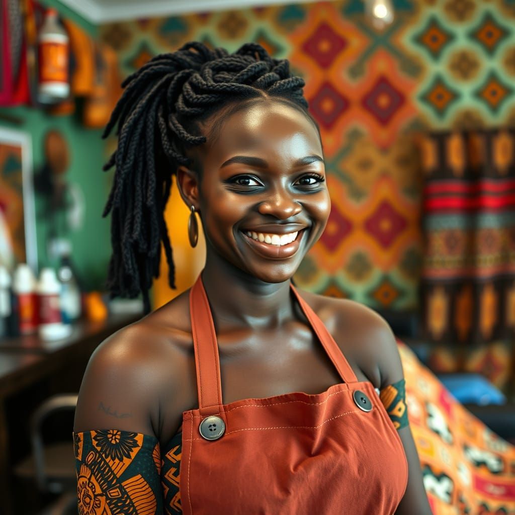 This image shows a vibrant and stylish hair salon in South Africa, where a smiling dark-skinned woman with braided hair stands out amidst traditional African patterns and colorful textiles, with a photo-realistic and lifelike quality reminiscent of contemporary African art
