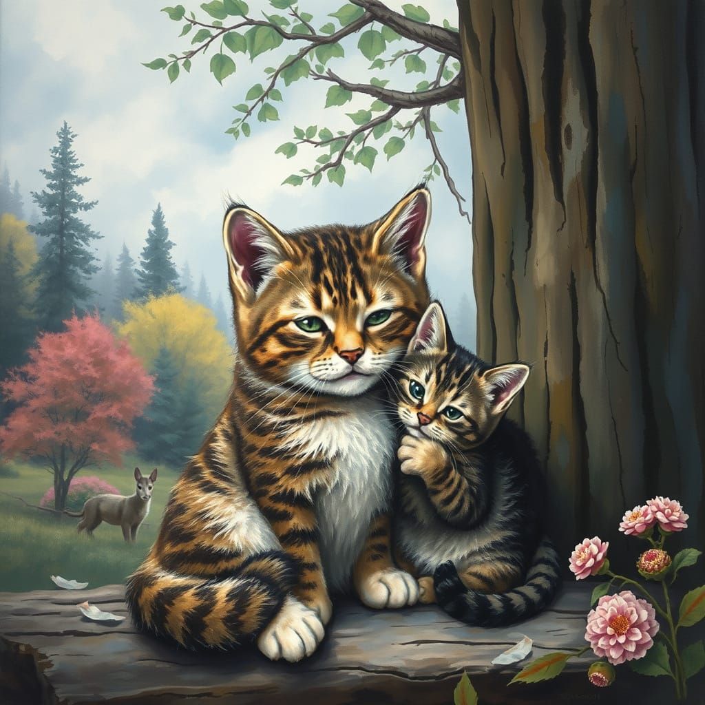 This image shows a boy tenderly embracing his cat in an ethereal, misty landscape. Rendered as a highly detailed charcoal drawing with gouache and watercolor elements and impasto brushstrokes, in a maximalist style.