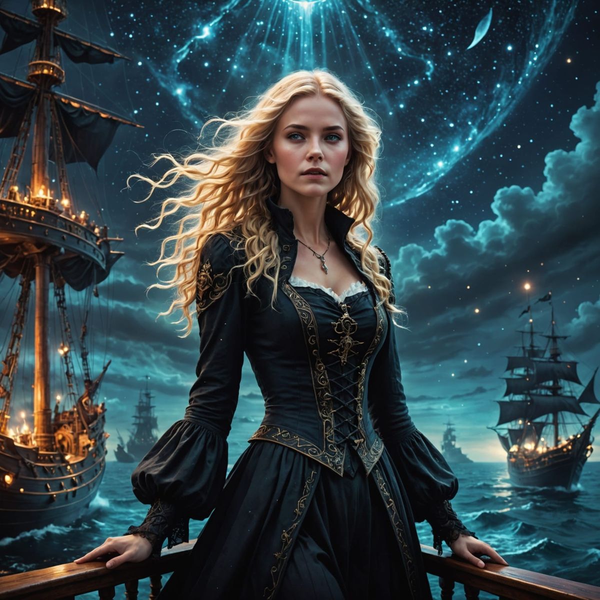 This image features a beautiful blonde woman with glowing hair on a ghost pirate ship sailing through a starry ocean, gazing at a portal. It evokes dark fantasy and gothic romance.