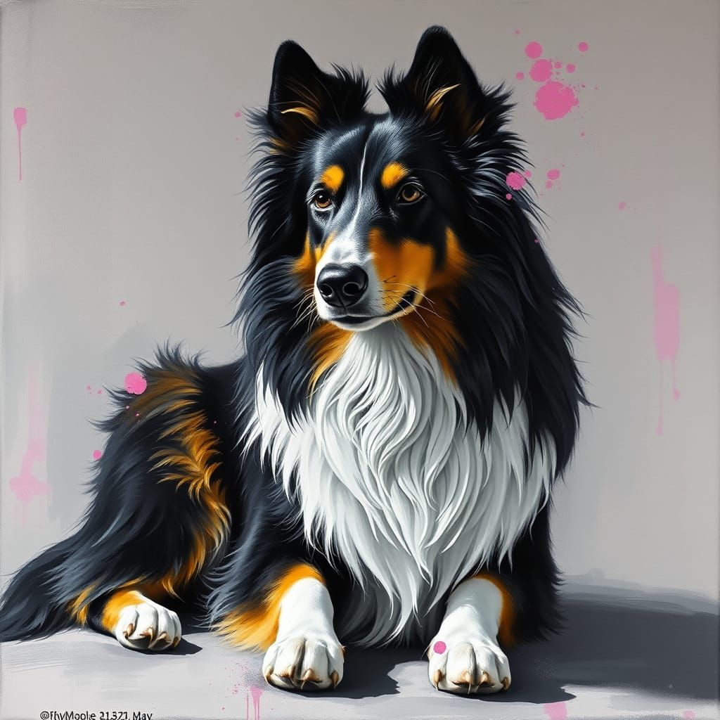 This image is a stunning, high-resolution representation of a majestic collie, intricately rendered with charcoal and gouache, blending traditional and modern techniques in a vibrant, polychromatic masterpiece that evokes the epic impressionism of a museum-quality work.