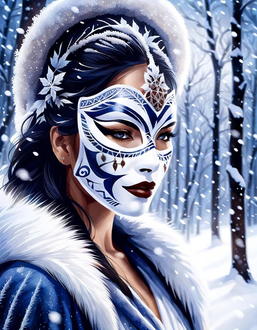 A digital rendering showing a woman in a voodoo mask during a mystical snowfall. The intricate mask contrasts with the cold climate to create an eerie and intriguing magic realism style.
