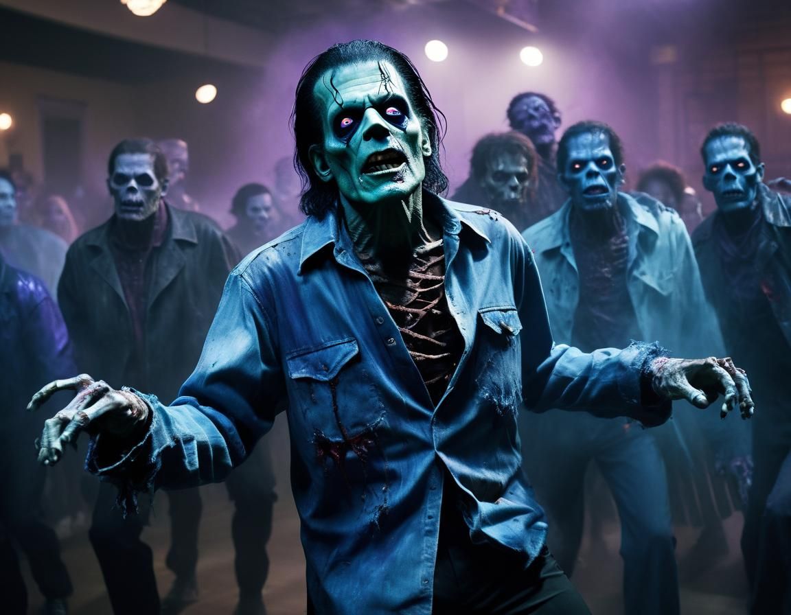 A medium shot capturing Frankenstein-Zombie Michael Jackson performing the Thriller dance at a high school Halloween party. The scene is lit with strobes, fog and high-contrast colors, creating a chaotic, high-energy atmosphere.