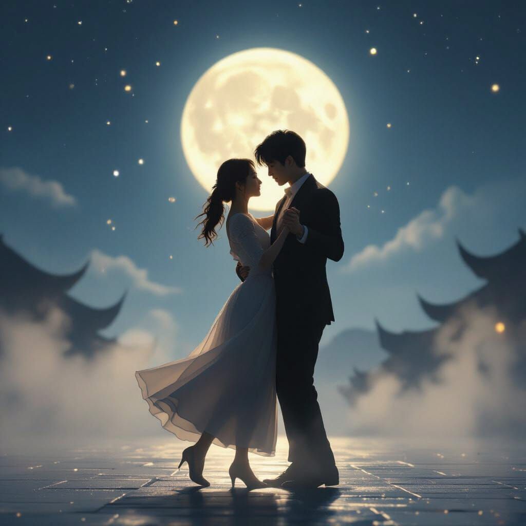 This image shows an Asian couple dancing intimately under a full moon in the night. The scene is romantic, with soft silhouettes and dreamy fog, in a cinematic style with elegant and moody tones.