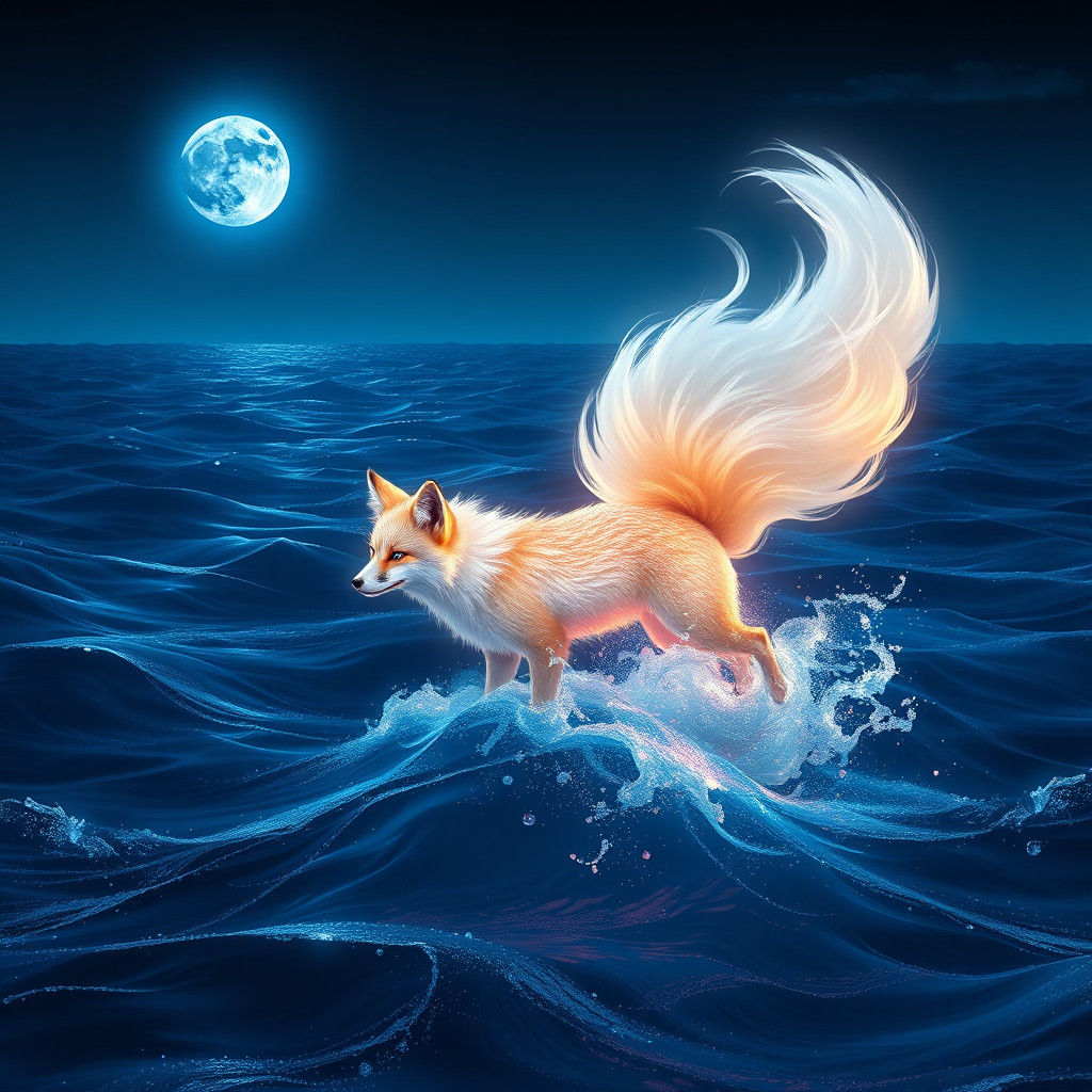A striking picture of a nine-tailed fox rising from a dark blue ocean under a blue moon. Rendered as 3D anime art, the image blends fantasy and hyper-realism with ultrafine detail.