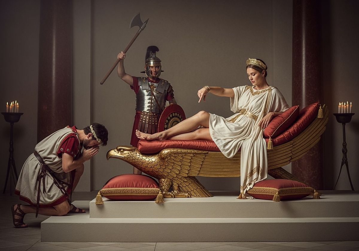 This image shows a Roman Empress in a gold toga lounging on an eagle-shaped divan. The scene, set in a throne room, features a kneeling peasant, a soldier with an axe, and cinematic lighting.