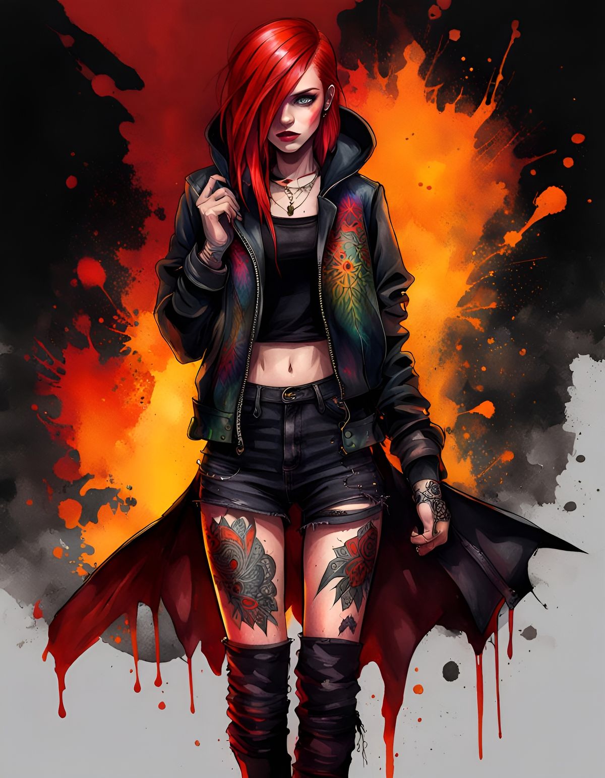 This image features a beautiful, stylish teenager with vibrant red hair and striking green eyes, adorned with tribal tattoos and witch symbols, all set against a dark, splash art-style background. As a hyperrealistic digital painting, the artwork shows a fantasy aesthetic.