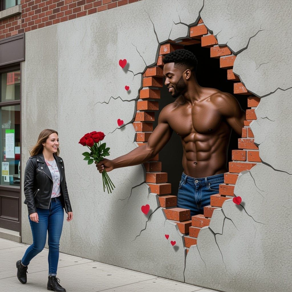 This image shows a subtle street art scene where a mysterious black figure appears to emerge from a wall, offering roses to a woman with a gentle smile, creating a sense of quiet love and connection in the city.