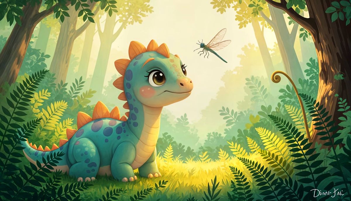 This image shows a baby Brachiosaurus in a Jurassic forest. The dinosaur is surrounded by ferns and bathed in warm sunlight, creating a magical scene in a fantasy illustration style.