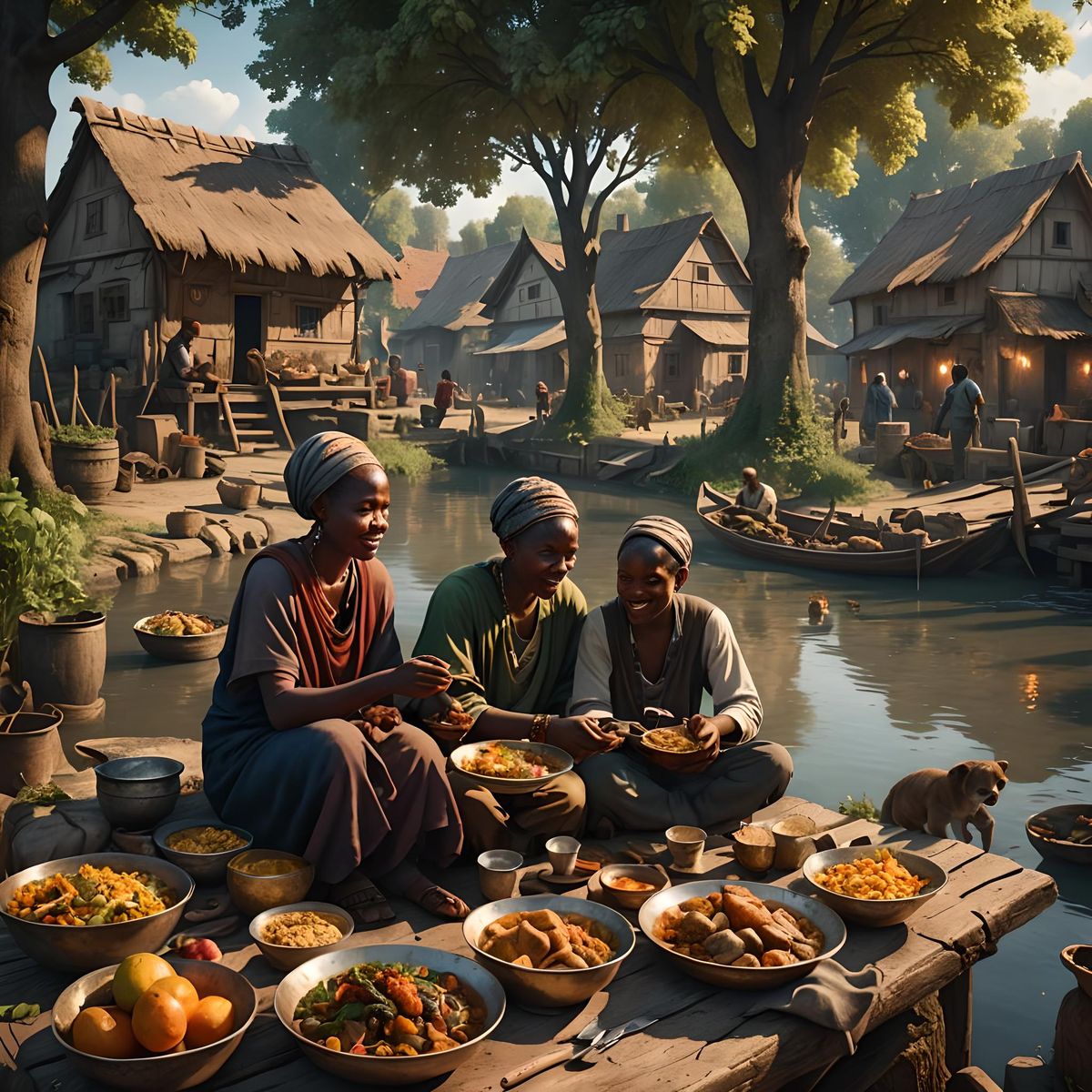 This image shows an African family sharing a meal in a riverside village. The artwork is detailed, with deep colors and intricate details, rendered as fantasy concept art.