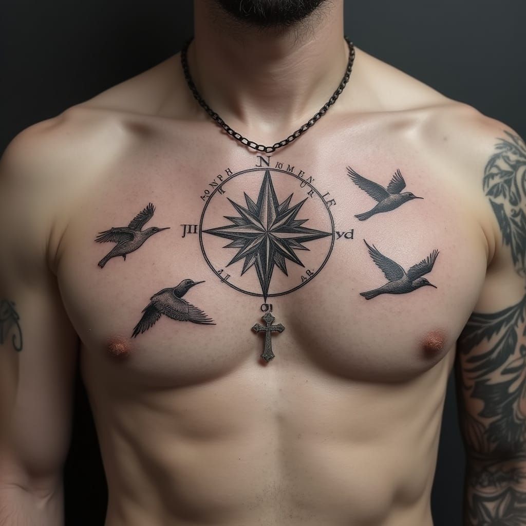 This image shows a man with a shoulder tattoo of a compass rose and hourglass. Broken chains morph into birds, with a name subtly outlined and a small cross nearby in a realistic style.