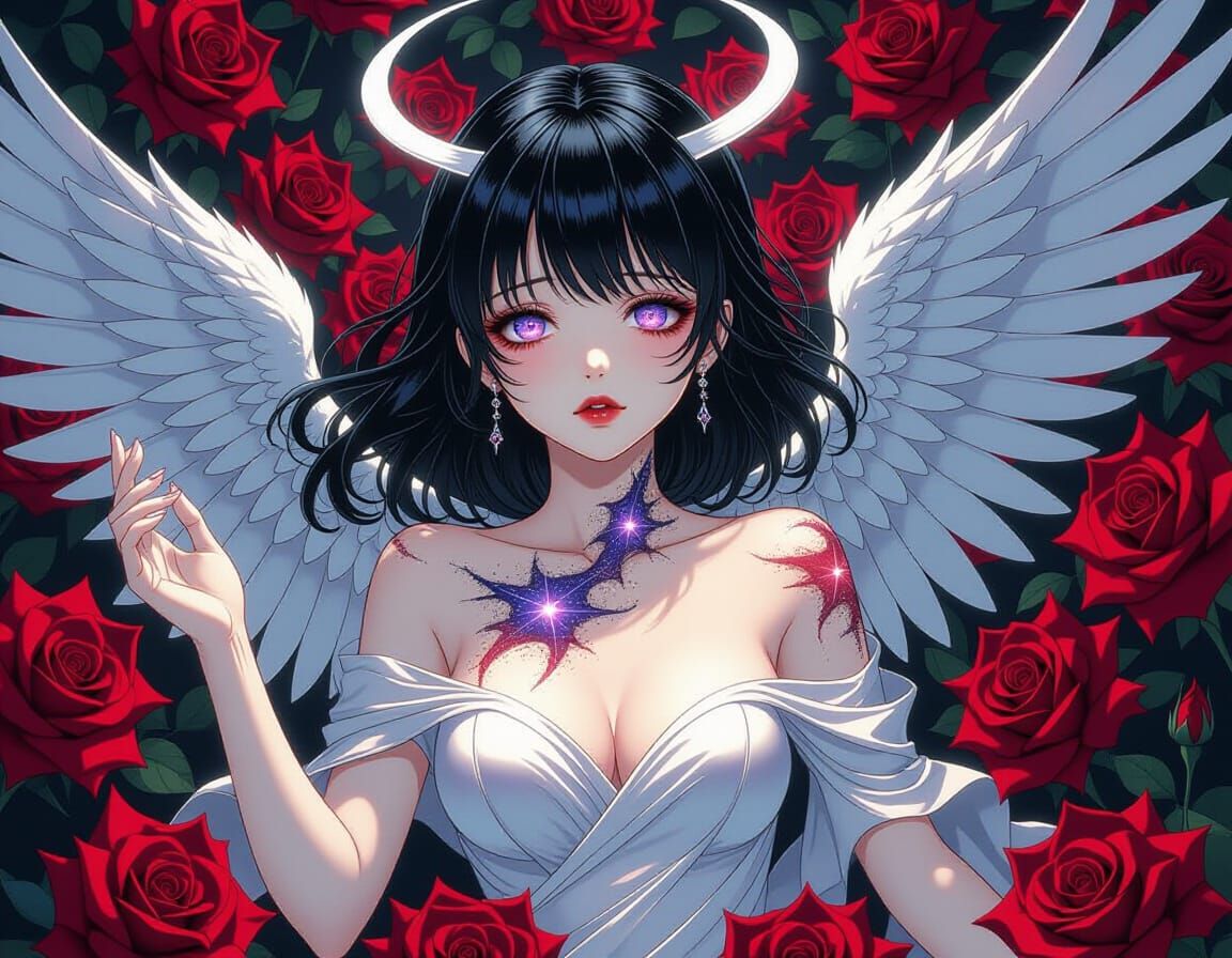This detailed ink artwork shows an angelic yet terrifying anime woman with galaxy eyes, floating amidst red roses turning into fangs. Her silk dress dissolves into starlight, revealing constellation tattoos. Surreal lighting and a crimson violet palette create a hyperrealistic horror-fantasy tone.