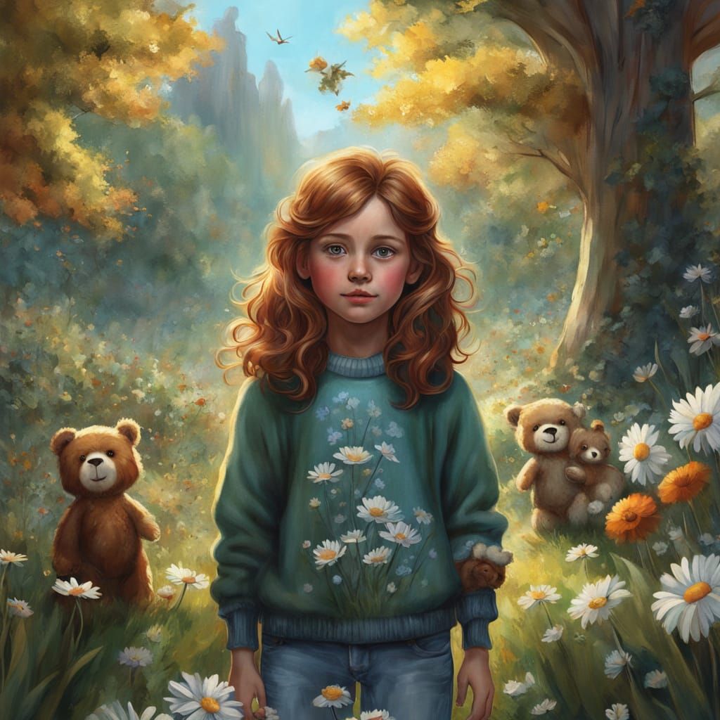 This detailed matte painting showcases a girl with chestnut hair and green eyes in a whimsical woodland. She wears a teddy bear jumper and daisy-adorned jeans, with flowers in her hair.