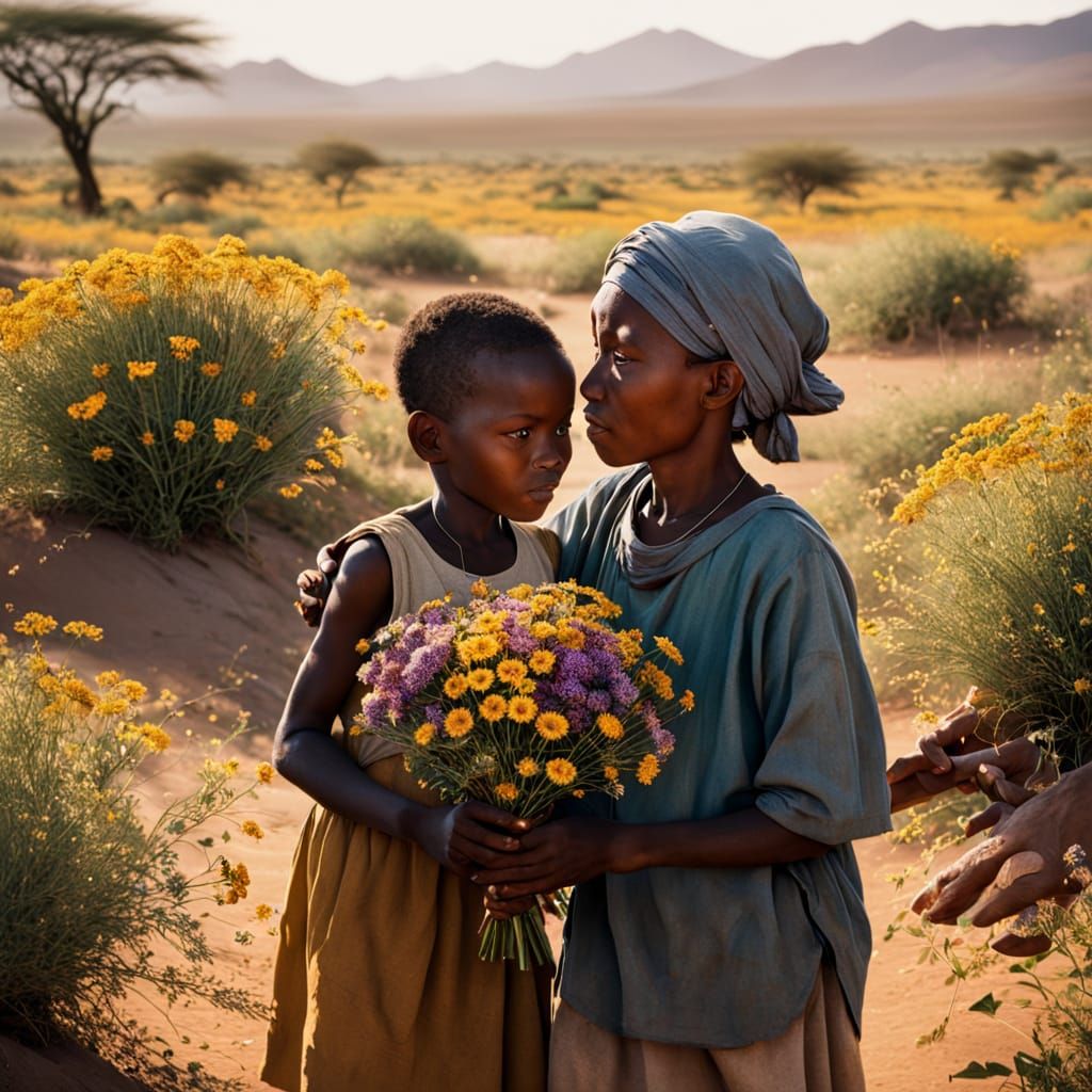 This image captures a heartwarming moment of a young child presenting a bouquet of vibrant wildflowers to an elder, set against a warm golden light and arid landscape, reminiscent of documentary photography in the style of Steve McCurry.