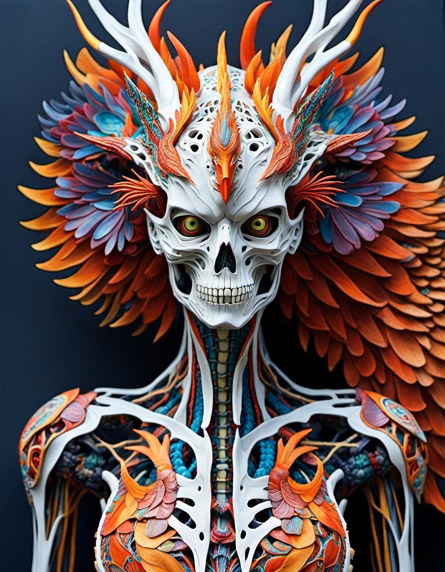 This image shows a hyperrealistic, colorful art brut decollage of a lycanthropic phoenix. The artwork features ethereal neural network organisms, a divine cyborg dragon, and biomechanical details in white and iridescent colors.