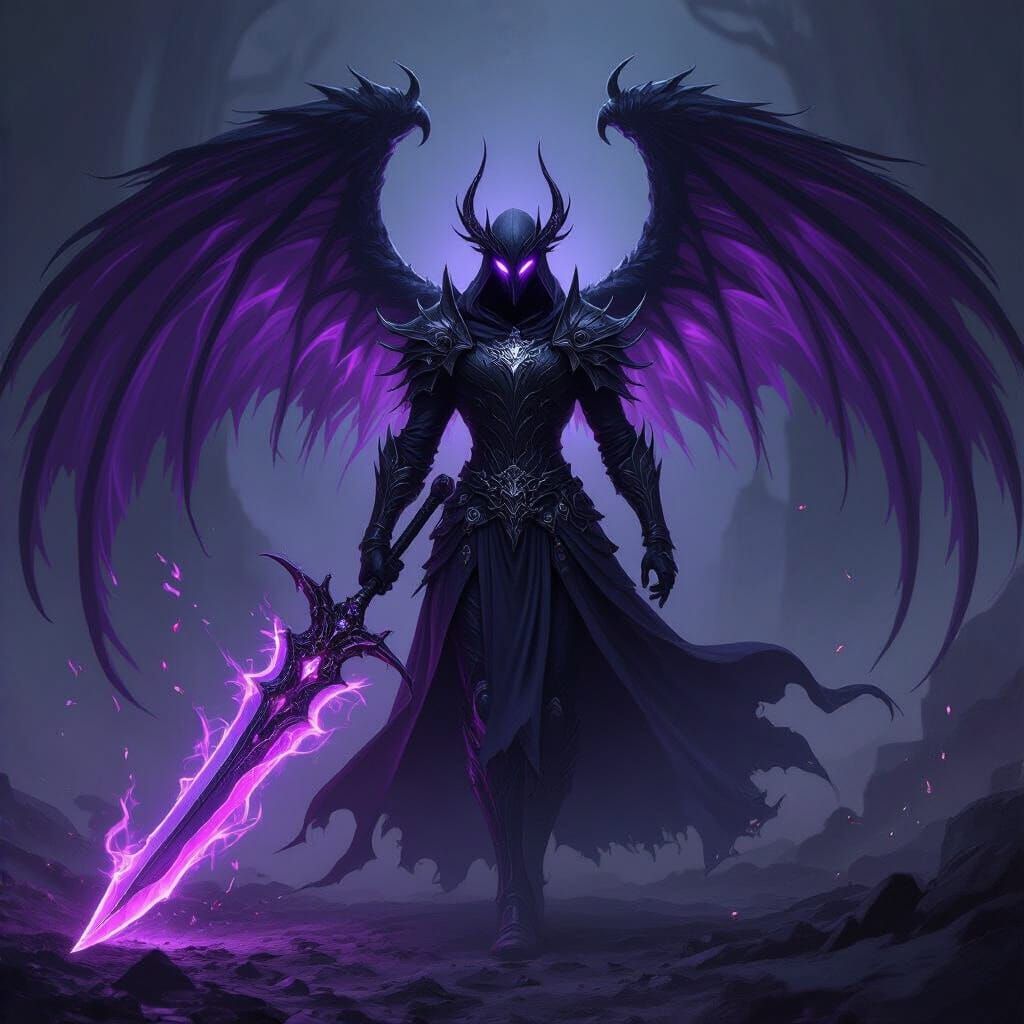This image depicts a dark, ethereal angel figure holding a weapon crackling with violet energy. The overall aesthetic is dark fantasy with a vibrant purple aura.