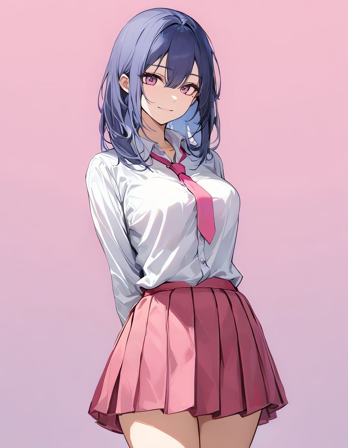 This image shows a young woman with long dark blue hair and pink eyes looking at the viewer. She is wearing a dark blue dress shirt and pink skirt against a simple white background.