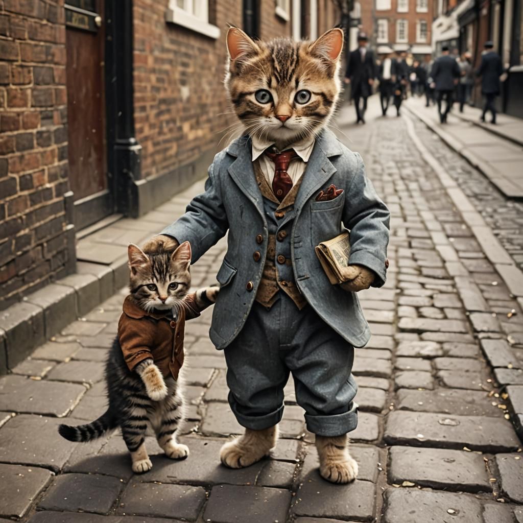 This image shows a kitten dressed in a tattered suit, stealthily pickpocketing a gentleman amidst the historic brick streets of 1900s London, rendered in a vintage style.