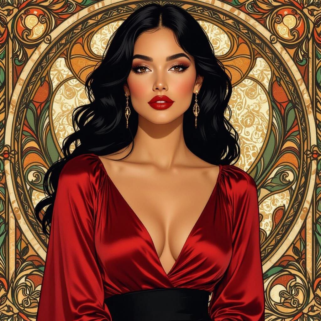 A portrait of a beautiful woman with fair olive skin, full lips, and flowing black hair. She wears a red silk shirt, black pencil skirt and elegant jewelry, in an Art Nouveau style.
