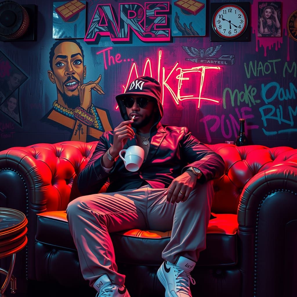 A digital artwork of a trap artist in a futuristic lounge. The scene features neon lights, graffiti art, and a blend of hip-hop and street art aesthetics with vibrant, high-contrast colors.