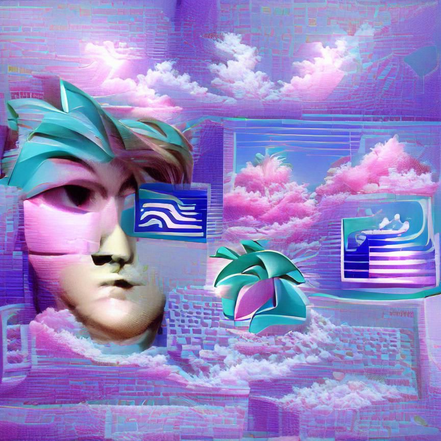 This image shows a vaporwave aesthetic. The art style is characterized by its use of 90's era computer rendering, dreamy haze and surreal, often satirical takes on consumer culture.
