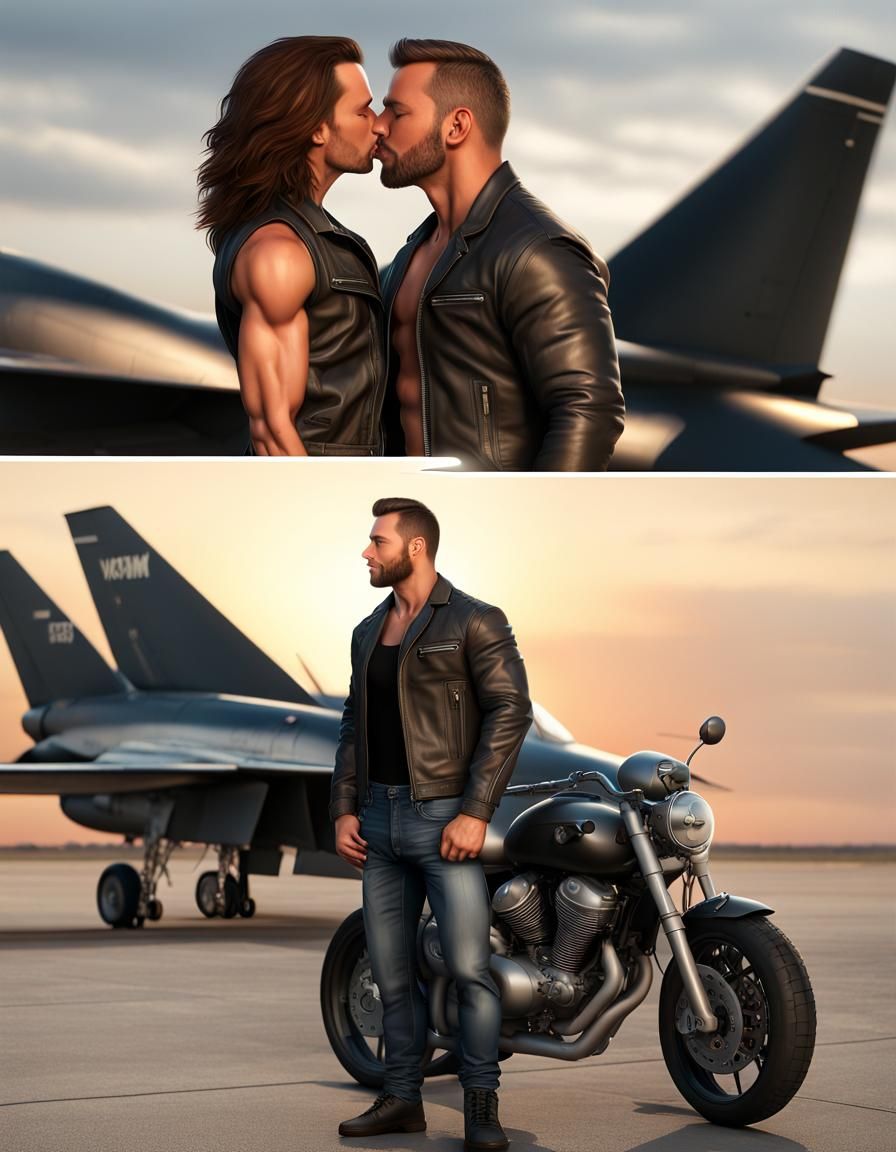 This image shows two muscular men kissing on an airport runway at sunset. One man wears a flight suit and leather jacket, the other wears jeans and a leather jacket. The image has a matte painting aesthetic.