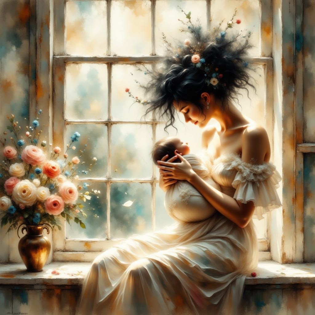 A textured image of a dark-haired woman in a white dress holding a baby. The image is rendered with thick brushstrokes and a blend of impressionist and grunge aesthetics using oil, watercolor and ink techniques.