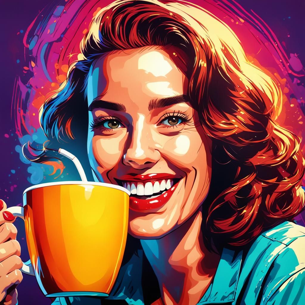 This image shows a woman enjoying an enormous cup of coffee with a straw. The close-up portrait uses vibrant, bold colors and comic book-style effects in a pop art aesthetic.