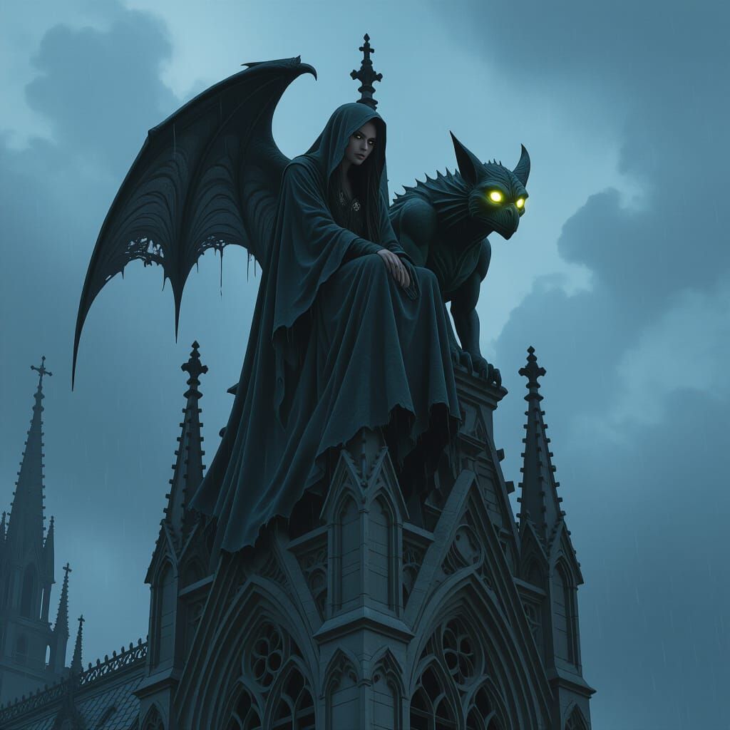 A dramatic digital matte painting of a woman and a gargoyle on a gothic cathedral spire during a stormy night, featuring volumetric lighting and intricate carvings.