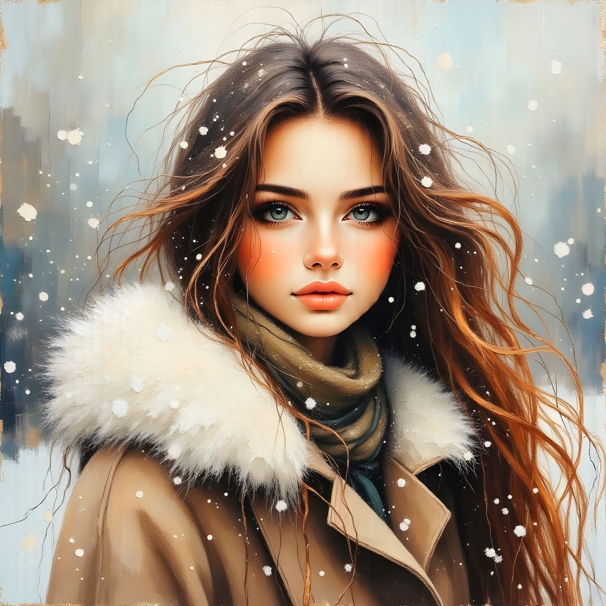 This image shows a shy woman wearing a fur-lined coat during a gentle snowfall. The art style is reminiscent of delicate, realistic oil paintings.