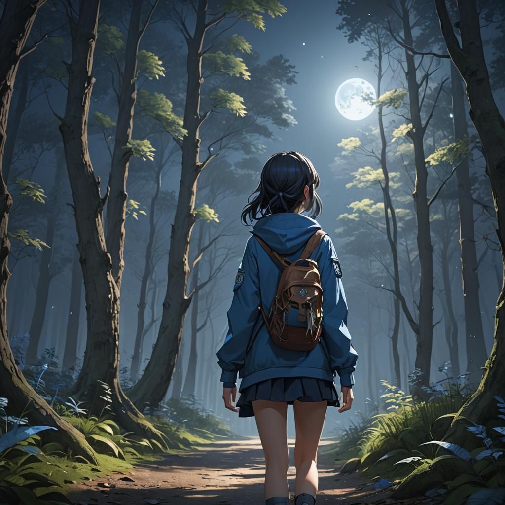 This image shows a young girl walking away into a moonlit forest. The artwork evokes a 3D anime aesthetic with detailed rendering and vibrant colors.