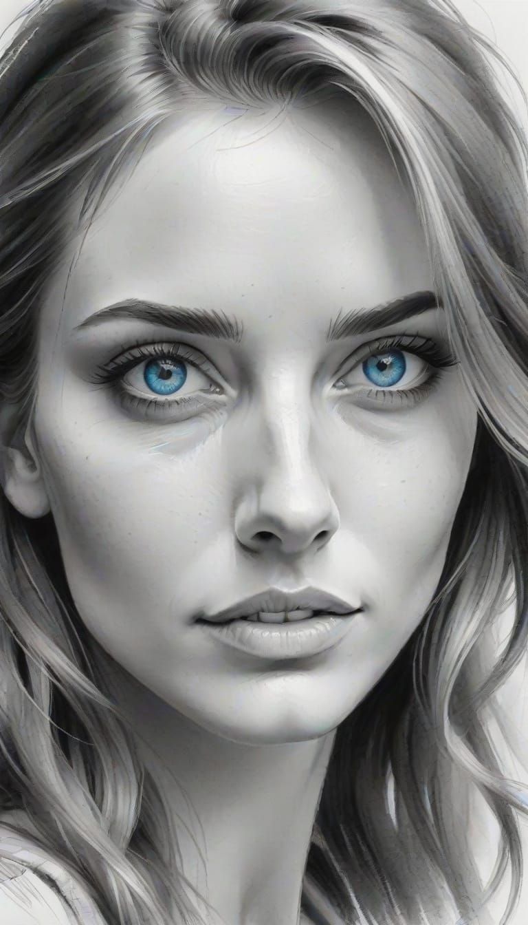 This image is a black and white pencil sketch of a woman with a pure, innocent gaze and striking blue eyes, featuring subtle smudges.