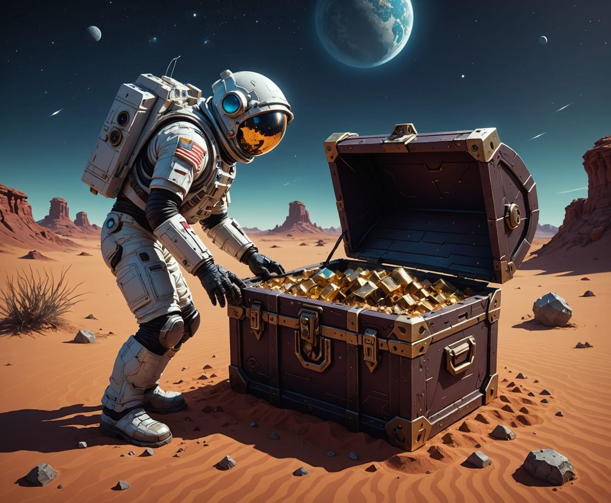 This image shows an astronaut finding a glowing treasure chest on a red alien planet. The concept art features dynamic lighting and intricate details, rendered as 8k resolution digital art.