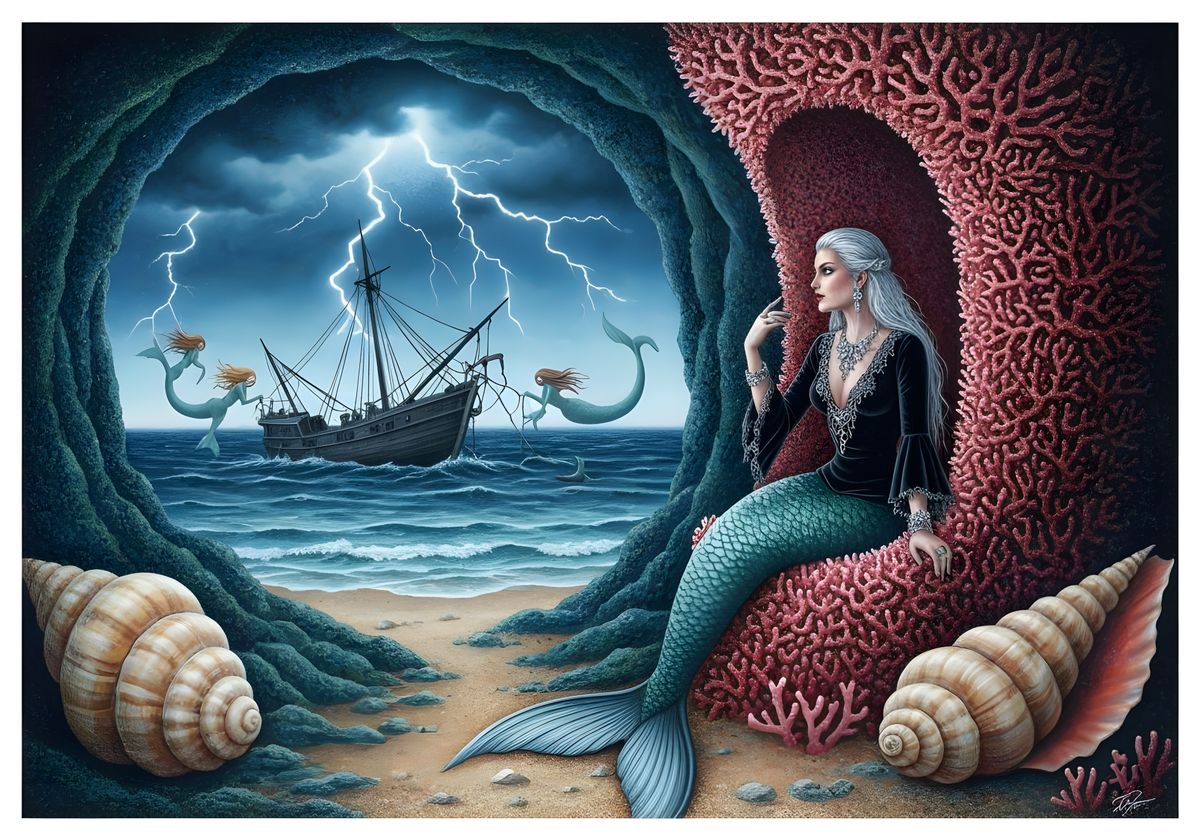 This image shows a gothic mermaid in a black velvet blouse and silver jewelry, seated on a coral throne. The scene depicts a stormy, dreamlike underwater cave with shipwrecks.